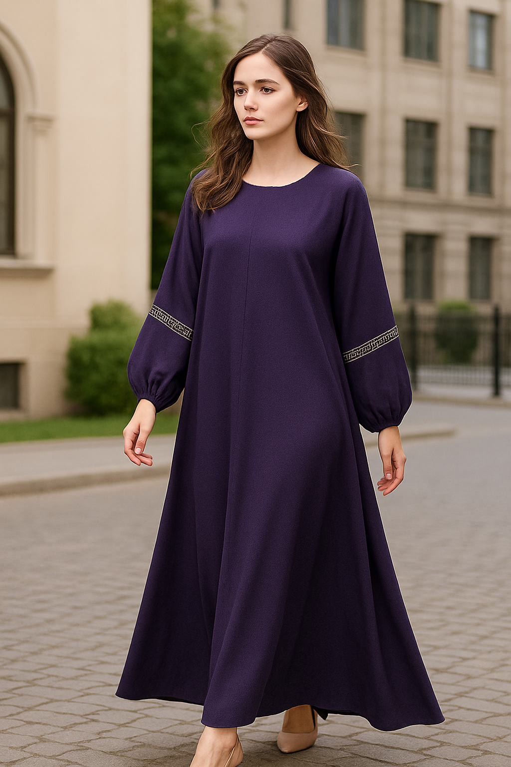 The standout feature is the beautifully embroidered skin-colored threadwork on the sleeves – adding a soft contrast and a hint of luxury. Ideal for formal gatherings, Eid celebrations, and everyday elegance, this abaya can be styled with heels, flats, or even sneakers for a chic modest look.